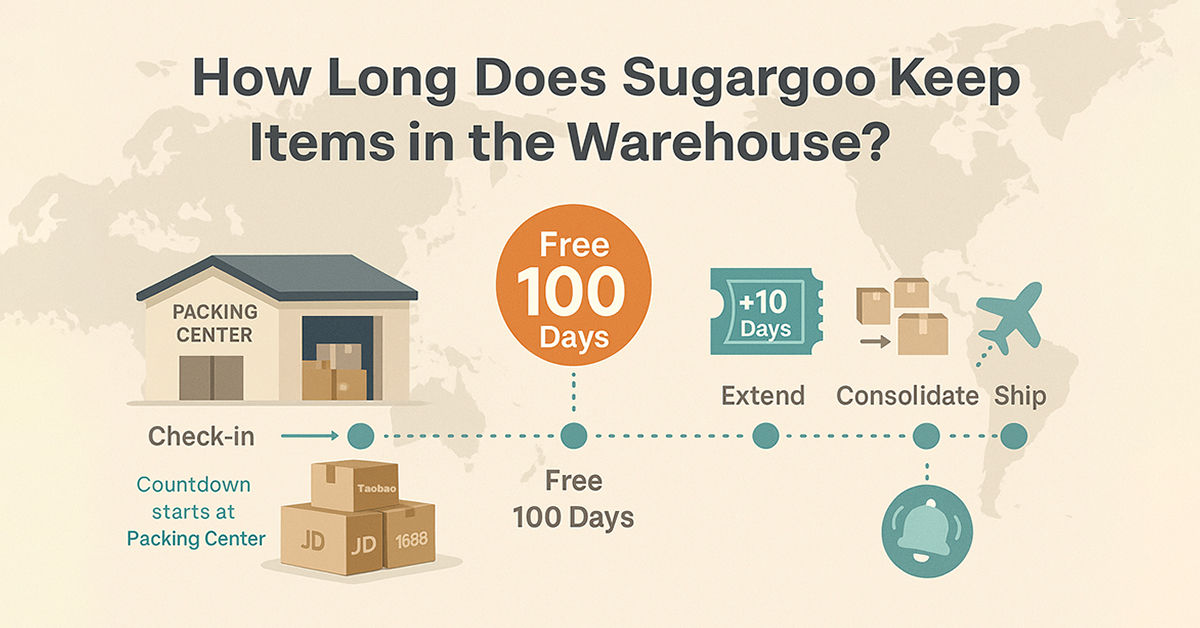 Many first-time users think the free storage period (100 or 30 days) starts when they place the order or when the seller ships it. In reality, the clock doesn’t begin until Sugargoo checks the item into the “packing center.”