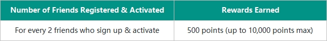 - For every 2 friends you invite who register and activate during the campaign, all 3 of you receive 500 points each