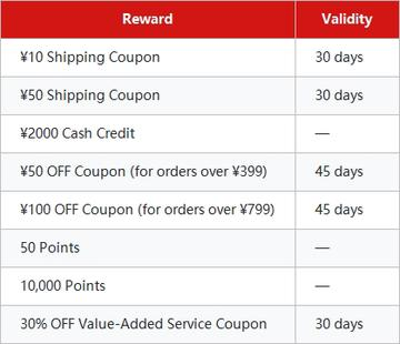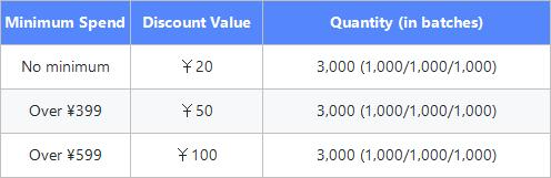 - Shipping coupons (¥20 / ¥50 / ¥100) can be stacked