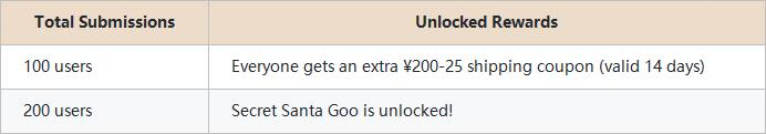 Once we reach 200 valid submissions, the Secret Santa Goo prize pool is automatically activated.